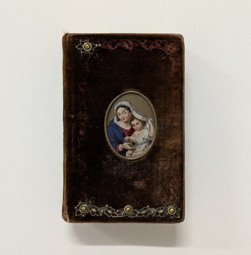 Copertina rigida con rivestimento in velluto marrone, centrata da miniatura raffigurante la Madonna con Bambino