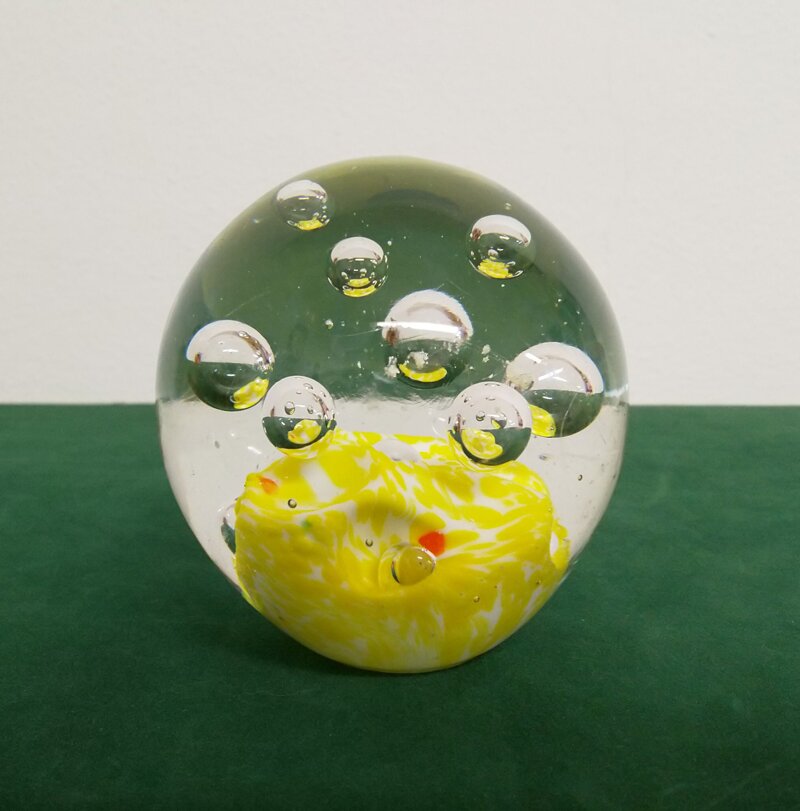 Palla fermacarte in vetro formata da un manto giallo con sfumature bianche, due punti arancio e bolle trasparenti cristallizzate